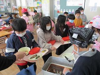 今日の給食に「しもつかれ」が出たので、興味津々で1年教室をのぞいてみました。意外なことに「お豆がおいしかった」「鮭がおいしかった」という反応で、おかわりをした子もいたそうです。家によって味が違う「しもつかれ」ですが、給食の「しもつかれ」は生臭くなく、とても食べやすかったからだと思います。調理員さんのおかげで、郷土料理の「しもつかれ」が好きになれてよかったです。