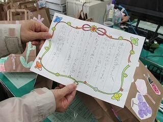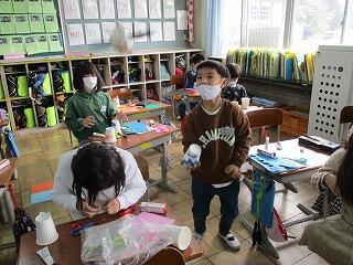 1年生は、「大地の恵みのなーさりぃ」の年長さんと交流学習をする予定でした。しかし、残念ながら中止になってしまったため、プレゼントを渡すことになりました。飛び出すおもちゃとお手紙を渡します。年長さんが喜んでくれるといいですね。
