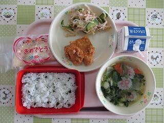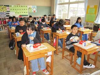 今週は中学校が卒業式、来週は小学校が卒業式です。今日の給食は「卒業お祝い献立」でした。6年生の感想です。「今日の給食は、スープや野菜、ごはん、デザートと、とてもおいしい給食でした。卒業お祝い献立で、とてもうれしい気持ちになりました。これで卒業式の練習や卒業式をがんばってやることができます。調理員さん本当にありがとうございました。」