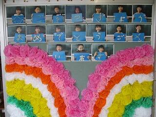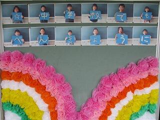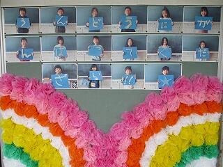 残念ながら卒業式に在校生は参加しませんが、体育館へ行く途中の廊下に1,2年生からのお祝いメッセージが貼ってあります。一人ひとり粘土で文字をつくったかわいらしいメッセージです。卒業式の練習の行き帰りに必ず目に留まるので、下級生の思いは卒業生に十分届いていると思います。