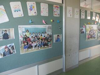 2階の廊下には思い出の写真が貼ってあります。6年教室は一番奥なので、通るたびに6年間を振り返ることができますね。肝心の6年教室は、これから飾りつけらるようなので、楽しみにしていてください。