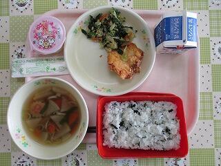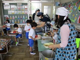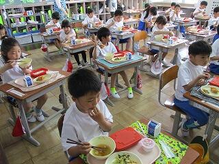 今日の給食は、入学おめでとう献立でした。1年教室をのぞいてみると、自分たちでしっかり給食当番をやっていました。また、吉野汁の「なると」に「祝」の字が書いてあるの見つけ、入学祝いのことだと分かると、とても喜んでいました。さらに、デザートにも同じ字が書いてあることにすぐに気付いていました。1年生の鋭さにびっくりしました。
