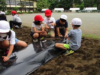 3年生がカボチャとスイカの苗を植えていたので、理科の学習かと思ったら、総合的な学習の時間の学びでした。トマトの和久井さんに教わったことを生かして植えたそうです。理科だったら、育ち方を観察するのが目的ですが、カボチャとスイカがこの後どうなるのか、とても気になるところです。おいしそうな実がなる苗に見えたのですが・・・