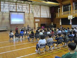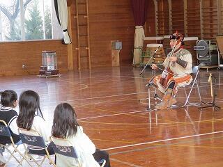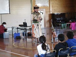 2・3年生が、モンゴルについて色々教えていただきました。2年生の国語の教科書に出てくる馬頭琴も演奏してくれましたが、ホーミーがすごい迫力でした。途中馬のいななきも入っていて、草原を疾走する馬の姿が目に浮かぶようでした。とてもよい体験ができました。