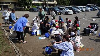 地震の後、火事が発生したという想定で、避難訓練を実施しました。あいにくの雨になってしまいましたが、地震や火事は天気に関係なくおきます。また、一人でいるときに災害にあうかもしれません。自分の身は自分で守れる子どもになってほしいと思います。