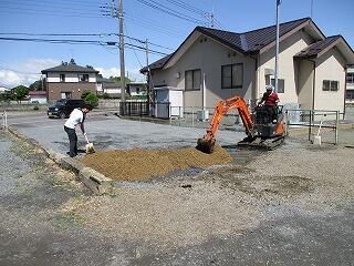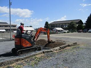 駐車場の入り口に水たまりができてしまったので、砕石を入れて整備しました。バックホーはPTA執行部からお借りしたものですが、操作しているのは教頭先生です。手慣れていて、駐車場に車が入ってくる前に作業が終わりました。