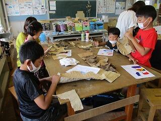 図書室の地域開放に併せて、図書支援員の斎藤さんの企画・運営で「ダンボール工作」をしました。講師は、地域おこし協力隊の保坂朱音さんでした。斎藤さんがブックトークをしてイメージを膨らませ、保坂さんの指導で、子どもたちは思い思いに作品作りに取り組みました。とても素敵な作品ができあがりました。夏休みの宿題が1つできましたね!?