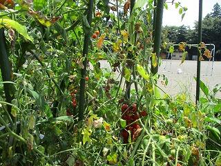 2年生の学級園に、ミニトマトやピーマン、ナスがなっています。夏休み中にだめになってしまうので、2年生は、自由にとっていいそうです。学校に来る機会があったら、他の友達のことも考えながら、野菜が無駄にならないように上手にとって行ってくださいね。