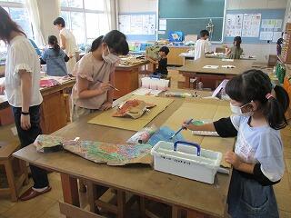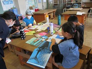 図書室の地域開放に併せて、図書支援員の斎藤さんの企画・運営で「ダンボール工作」をしました。講師は、地域おこし協力隊の保坂朱音さんでした。斎藤さんがブックトークをしてイメージを膨らませ、保坂さんの指導で、子どもたちは思い思いに作品作りに取り組みました。とても素敵な作品ができあがりました。夏休みの宿題が1つできましたね!?