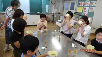 午前中は、すこやかサークルの体験講座で、野菜スープとホットケーキ作りをしました。自分で作った料理は格別だったようです。後片付けまでしっかりやっていて感心でした。夏休み中、家でも手伝いができるといいですね。すこやかサークルの皆様、大変お世話になりました。