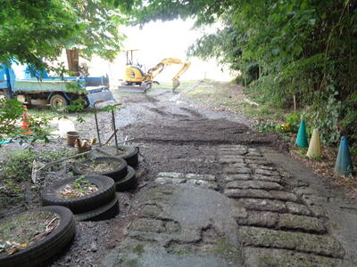職員でも何度か補修しましたが、大雨が降るたびに通路がえぐられ、大谷石が丸見えになってしまっていました。