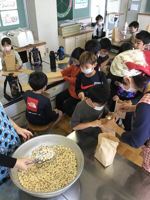 後から後からできるたくさんのポップコーンですが、子どもたちの話し合いでは、「おうちの人にも食べさせたい」ということになっているらしく、一人一人の紙袋には「もちかえり」と書いてありました。