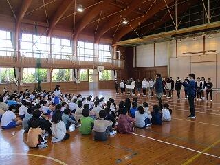 今日は、体育館で1年生と保育園年長児との交流を行いました。