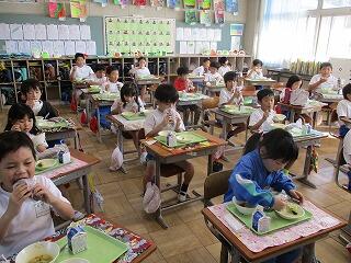献立が「ココアパン」だったとき、給食に本当の「ココアパン」がでたら、「ココア揚げパン」だと勘違いしていた子どもたちから落胆の声があがりました。しかし、今日は正真正銘の「ココア揚げパン」がでたので、子どもたちは大喜びでした。口の周りを真っ黒にした写真を期待しましたが、1年生も上手に食べていて感心しました。
