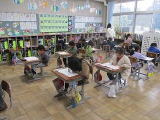 1~5年生の学力テストの日でした。教室をのぞくと、1年生も真剣に取り組んでいました。朝から雨が降っていたせいもありますが、午前中、校舎内が静まり返っていました。
