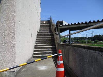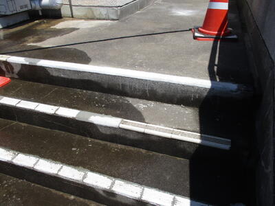 階段の角のタイルがはがれており、万が一の避難の際には危険になる可能性があるためです。