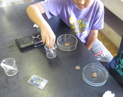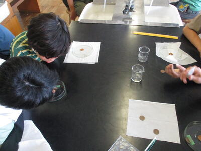 今日のサイエンスクラブは、10円玉磨きに挑戦です。酢と濃縮レモン果汁をそれぞれ10円玉にかけ、どちらがどれくらい10円玉をきれいにするかを実験しました。
