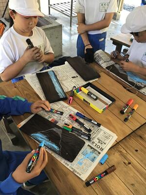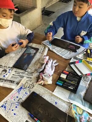 子どもたちは事前にデザインを考えてあり、自然生活体験学習の杉板焼作りで同様の体験をしているので、それを生かすことができたかな?