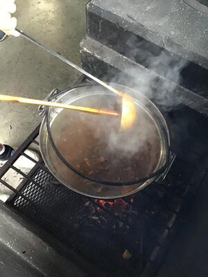 熱さと煙さに耐えながら杉の板を焦がしていきます。