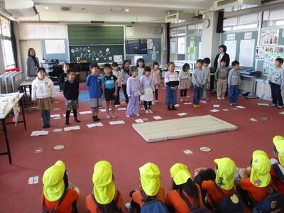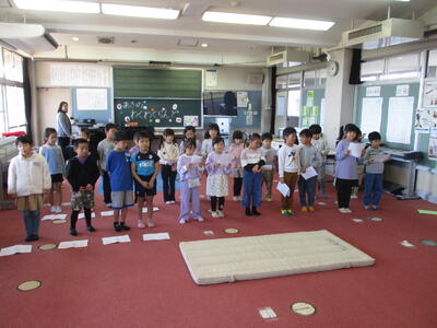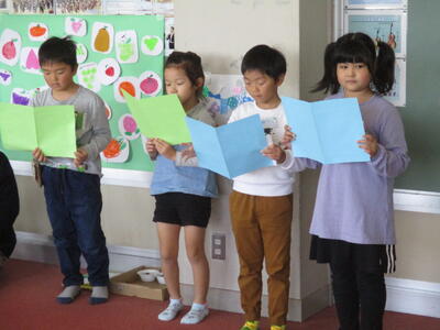 初めの会の後、1年生から歌と音読のプレゼントをしました。
