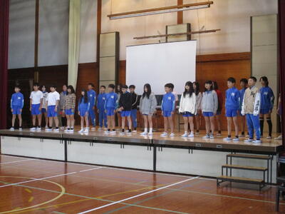 今日の業間時に、全校生の前で合唱を披露してくれました。