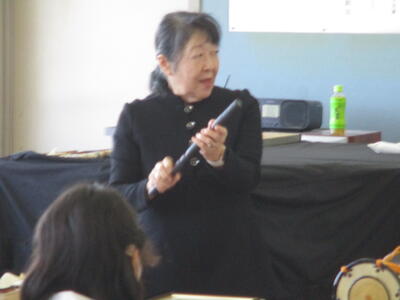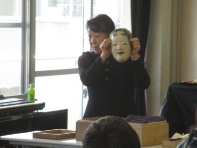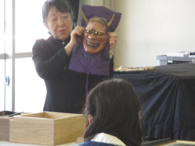 子どもたちは、本物の面(おもて)や楽器なども見せていただき、教科書で学習した内容をさらに深めることができました。