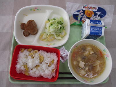 メニューは、「栗ご飯、ハンバーグおろしソースがけ、浅漬け、けんちん汁、お月見クレープ、牛乳」です。