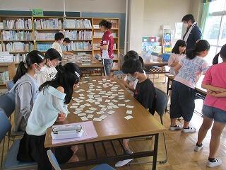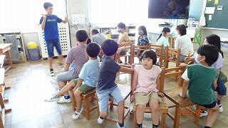 連日暑い日が続いています。今日も熱中症が心配される天気だったので、なかよし集会は、室内の遊びに切り替えました。どの班も雨天時の計画をしっかり立てていたので、「なんでもバスケット」や「いすとりゲーム」、「絵しりとり」など、縦割り班でなかよく遊んでいました。