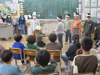 2年生が、国語の教科書に載っている「お手紙」を音読劇にして、1年生に見せてくれました。どの子も音読が上手で、「かえるくん」や「がまくん」の気持ちが伝わってきました。また、1年生も見る態度が立派で、感想をしっかり発表することができました。「お手紙」の最後の場面のように幸せな気持ちになる時間でした。