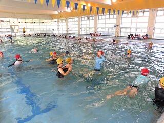 4~6年生みんなで、プールの中を大きな円を描くように歩いて水流を起こし、流れるプール遊びをしました。その後、いろいろな泳ぎ方を練習して、充実した時間を過ごしました。