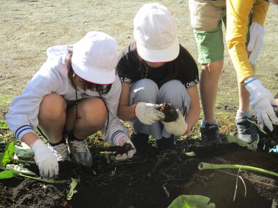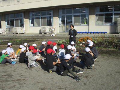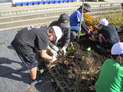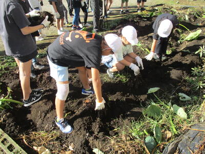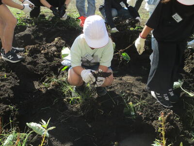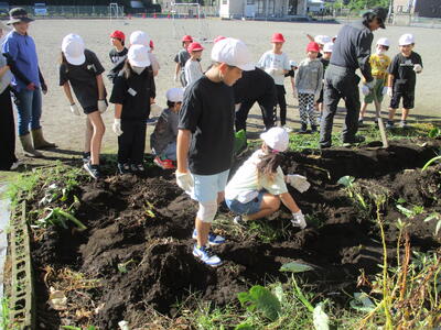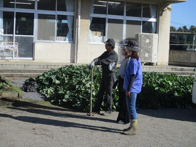植え付けからお世話になっている学校前の石川様と保護者3名の方にお手伝いいただきました。