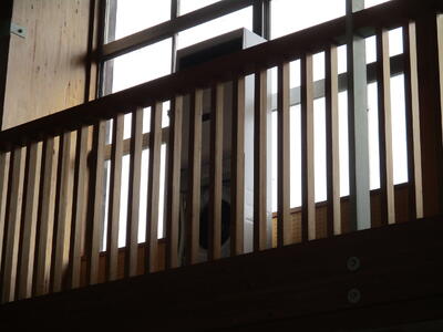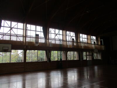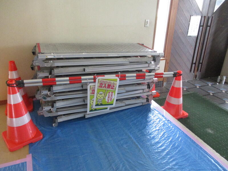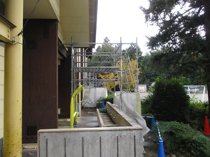 体育館玄関に工事用の資材が置かれていたり外壁に足場が組まれていたりしますので、十分ご注意ください。