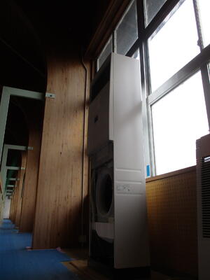 キャットウォーク部分に東西4台ずつ計8台の室内機が運び込まれ、取り付けを待っています。