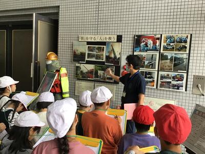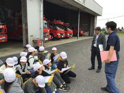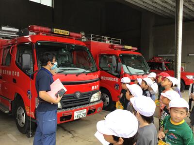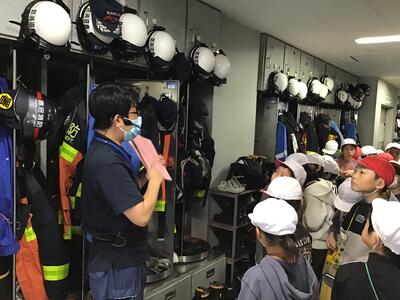 通信指令室を見学したり、消防署にある車両や消火の際に使用する防火服などを見せていただいたりしました。