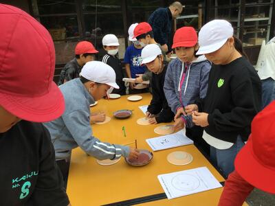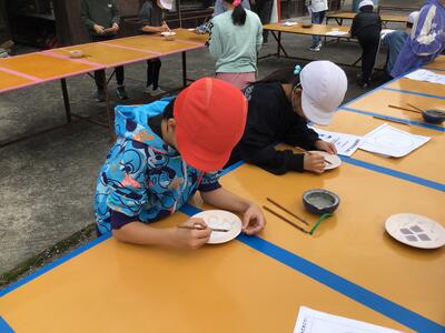 子どもたちは事前にデザインを考えてあり、自然生活体験学習の杉板焼作りで同様の体験をしているので、それを生かすことができたかな?