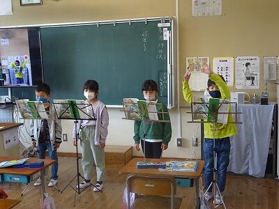 2年生、音読発表の練習中話の内容に合わせた動きも、バッチリ
