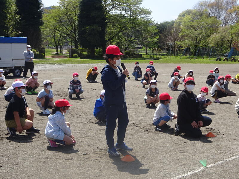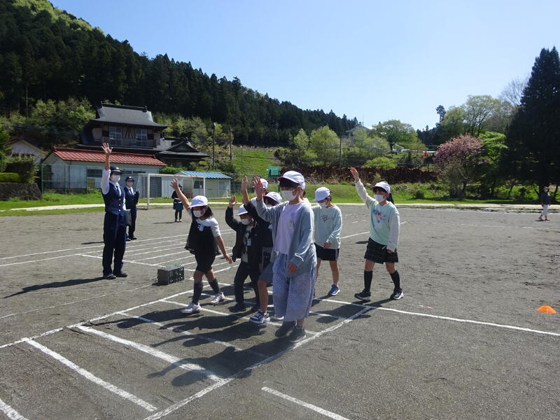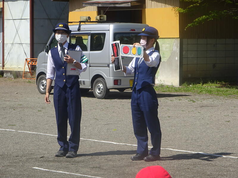 交通安全教室を実施しました。鹿沼市の交通教育指導員の鈴木様と警察署交通課の塩島様にご指導をいただき、模擬道路を使用して、横断の仕方等を確認しました。