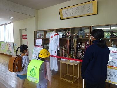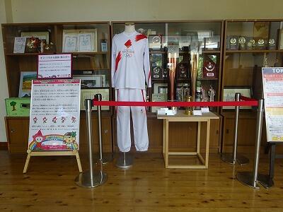 本校の昇降口に、東京2020オリンピック・パラリンピックの聖火リレーのトーチ、聖火ランナーのユニホーム等が展示してあります。「夢を感動へ。感動を未来へ。」いちご一会とちぎ国体に向けた鹿沼市実行委員会の取り組みです。