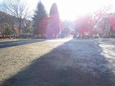 校庭の遊具も朝日の当たる側はすでにとけています。