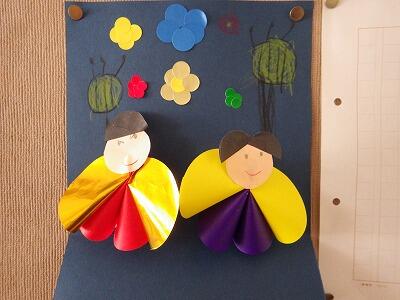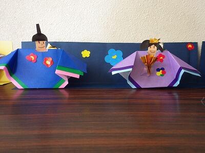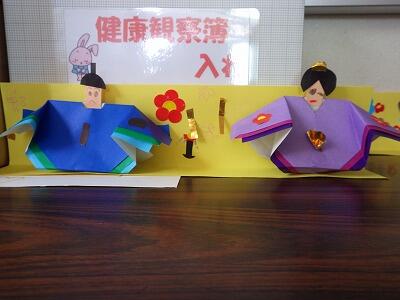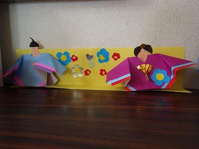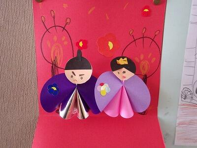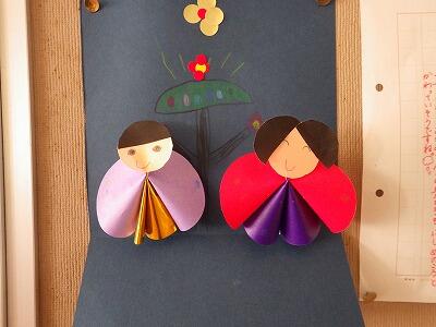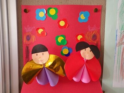 1年生の廊下の壁に、新しいお雛様が掲示されました。