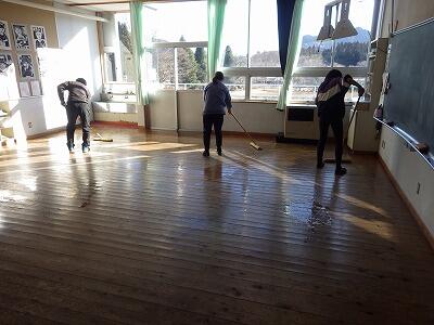 下校後の各教室を教職員で再清掃し、ワックスをかけました。