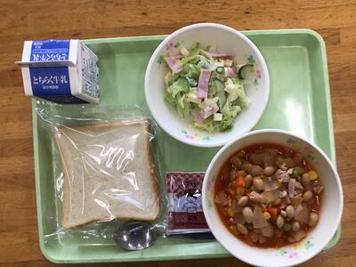今日の給食は、食パン、牛乳、チョコレート、ポークビーンズ、ハムチーズサラダでした。少し寒い日でしたが、みんなで美味しく食べられました。