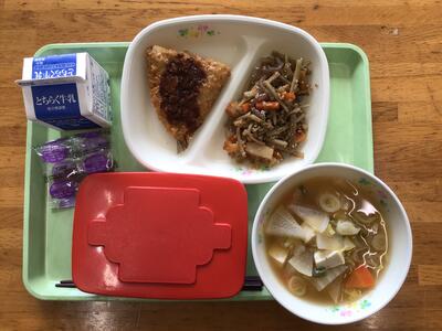今日の給食は、ご飯、牛乳、アジフライ、五目きんぴら、けんちん汁、グミでした。明日のいい歯の日にちなんで、かみかみ献立でした。かみかみ献立のグミは、普通のものより少し硬めだそうです。