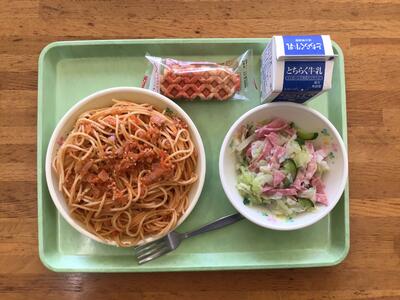 今日の給食は、ミートスパゲッティ、牛乳、ハムのマリネ、チーズドックでした。子供達に大人気のメニューです。みんなとても美味しそうに食べていました。