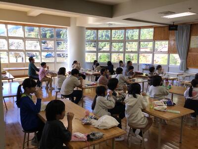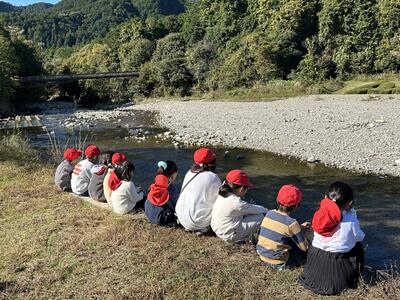 今日の2、3校時に、1、2年生が秋祭りに使う木の実などを取りに行きました。自然いっぱいの板荷ですので、子供達の作品に使える材料がたっぷりあります。夢中になって色々な材料を探しました。(写真は川の前で撮った記念写真です)
