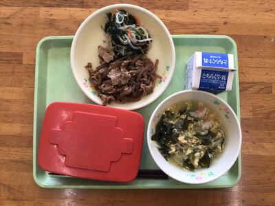 今日の給食は、ご飯、牛乳、ビビンバの具、ワカメスープでした。ビビンバは人気メニューです。とっても美味しくいただきました。