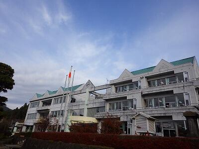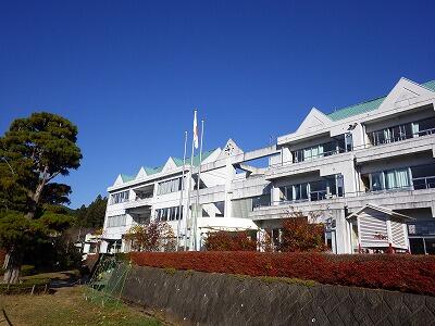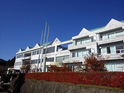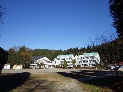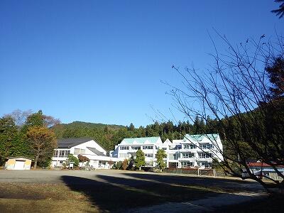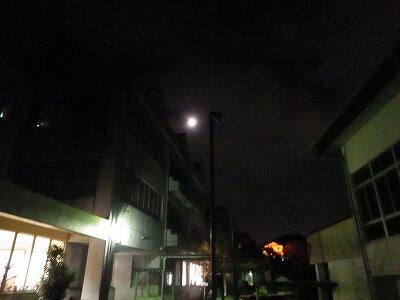 手前の灯りが小学校校舎、奥のオレンジの灯りが中学校です。