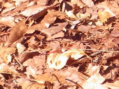 落ち葉の中に羽を休めている赤トンボを発見しました。