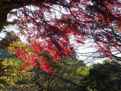 明るく、どこまでも高い青空を背景に、木々に残る紅葉が美しいです。