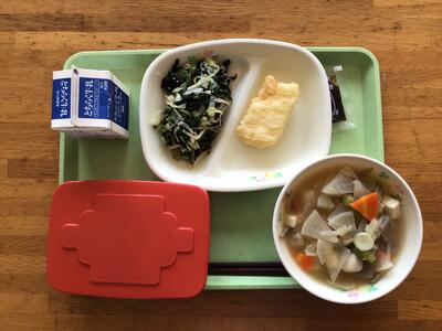 今日の給食は、ご飯、牛乳、鶏肉の香味焼き、切り干し大根の煮物、さつま汁でした。ご飯のおかずにぴったりのメニューでした。気温が上がらなかったのですが、さつま汁で体が温まりました。